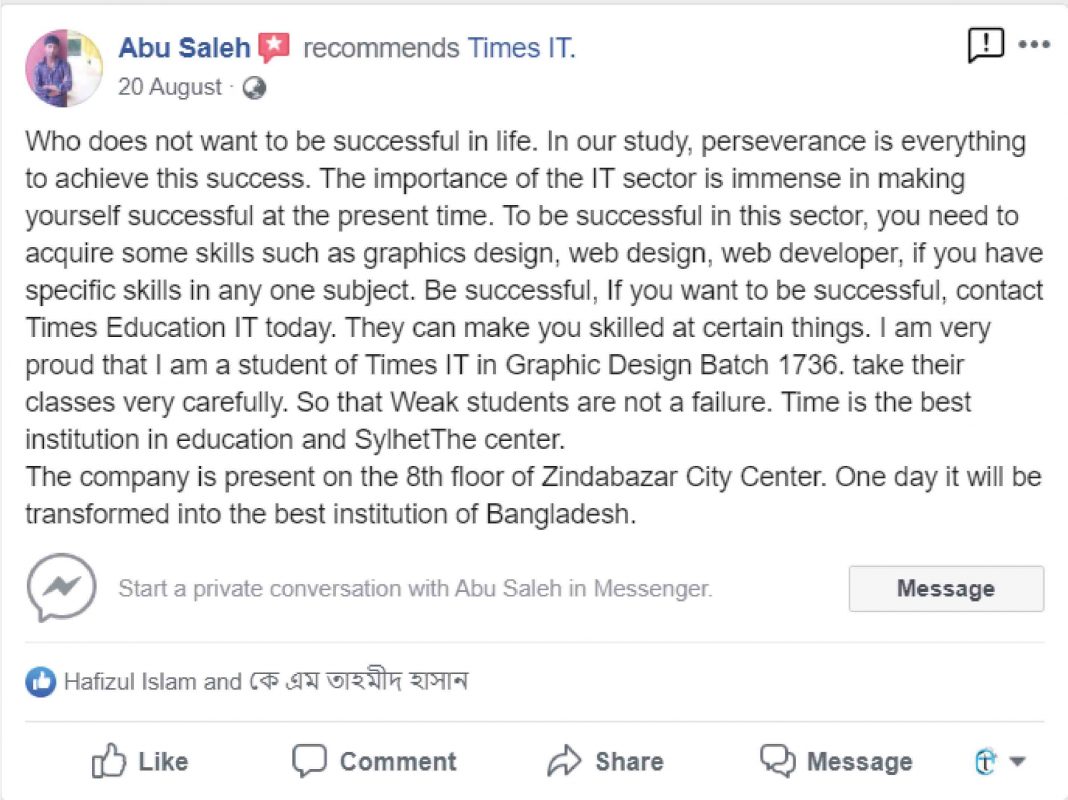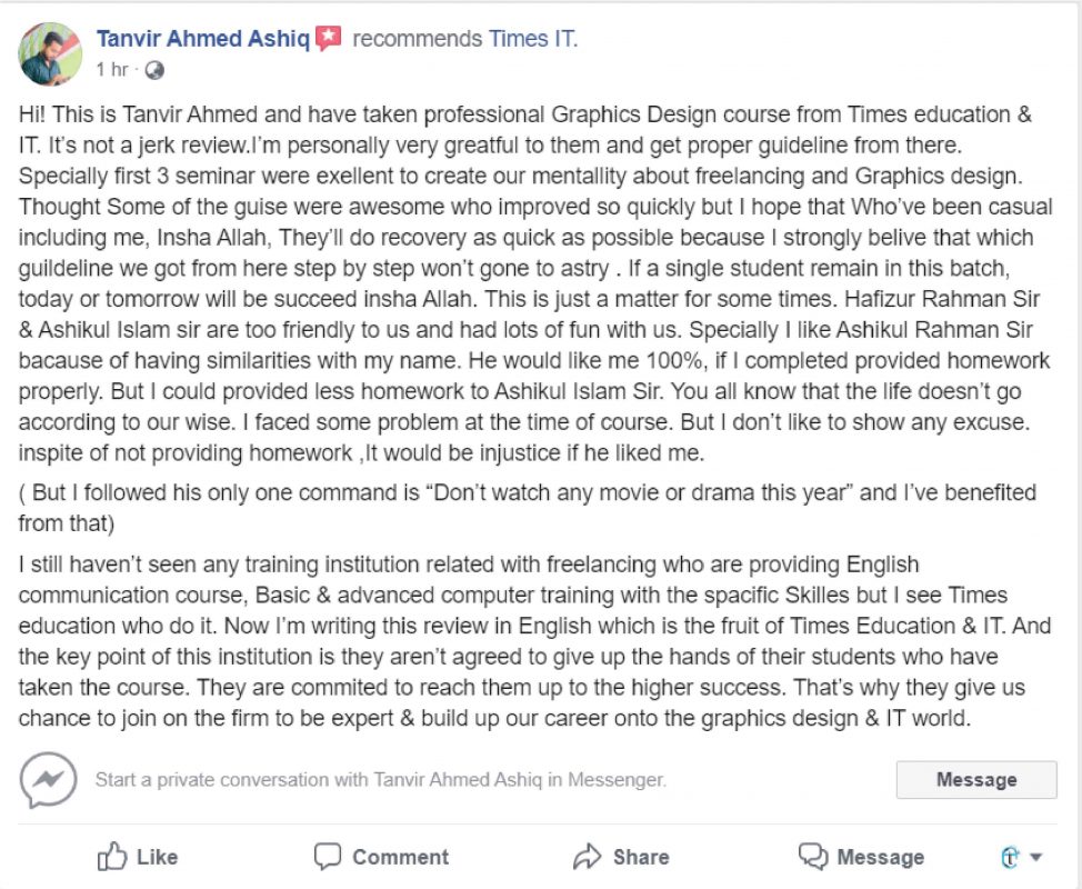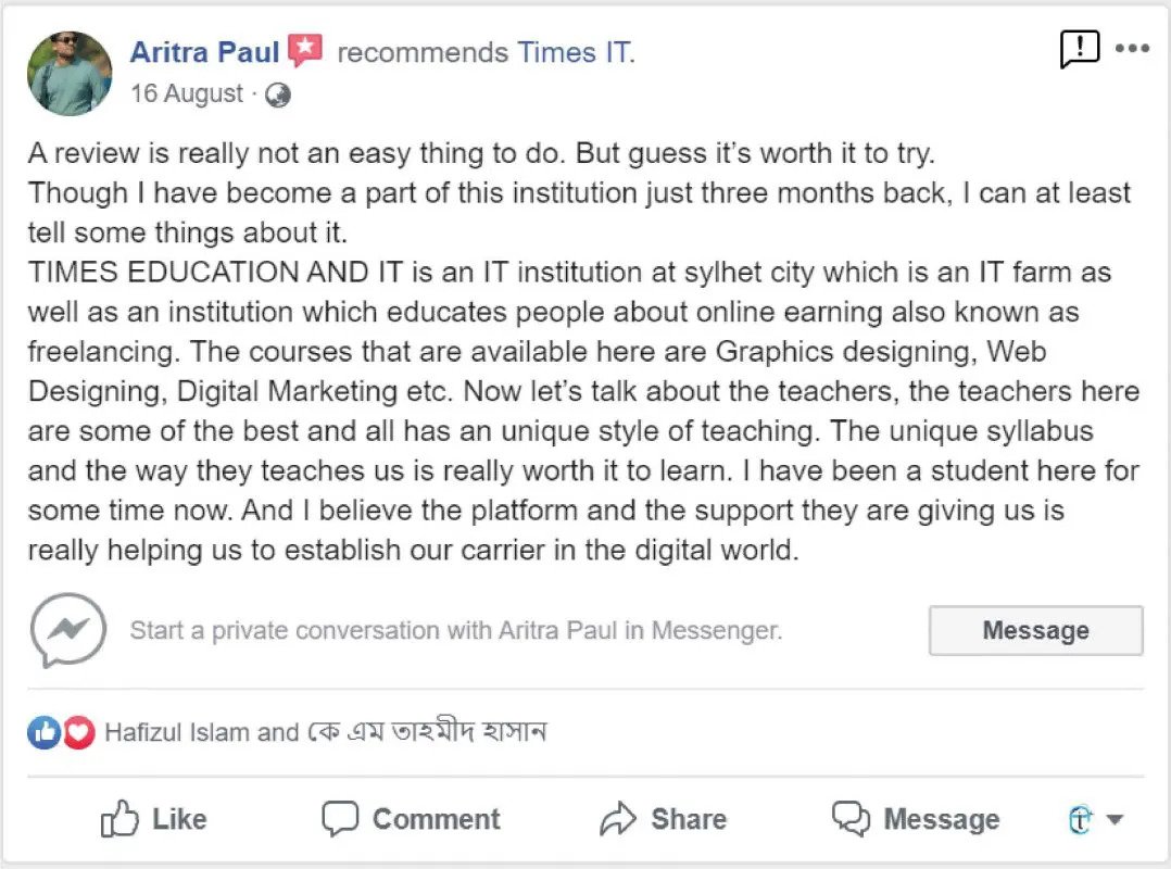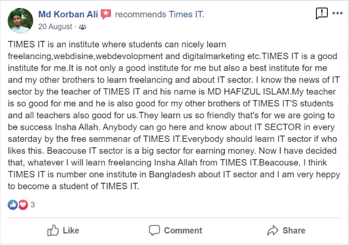 আপনি যদি মনে করেন আপনি মেধাবী কিন্তু আর্থিকভাবে অসচ্ছল, তাহলে নির্দ্বিধায় আজই যোগাযোগ করুন টাইমস আইটি অফিসে। সিলেটের সেরা ফ্রিল্যান্সিং ইনস্টিটিউটে আপনার জন্য সুযোগ অপেক্ষা করছে।