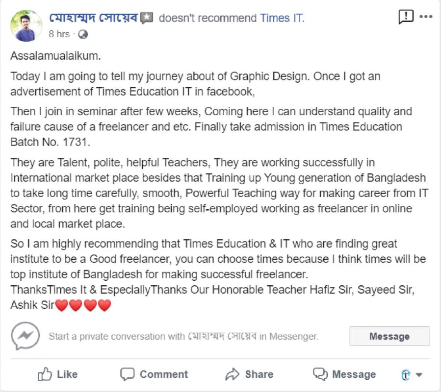 টাইমস আইটিতে আমরা বিশ্বাস করি, শিক্ষার্থীদের সফলতাই আমাদের সবচেয়ে বড় পরিচয়। প্রতিটি শিক্ষার্থীর অর্জন আমাদের জন্য গর্বের, প্রতিটি সাফল্য আমাদের সামনে এগিয়ে চলার প্রেরণা।