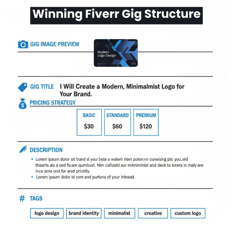 ট্যাগ নির্বাচনে সতর্ক থাকুন। Fiverr সর্বোচ্চ ৫টি ট্যাগ অনুমোদন করে, তাই সবচেয়ে প্রাসঙ্গিক এবং সার্চ করা ট্যাগ ব্যবহার করুন। “logo design”, “brand identity”, “business logo”, “minimalist logo” ইত্যাদি জনপ্রিয়।
