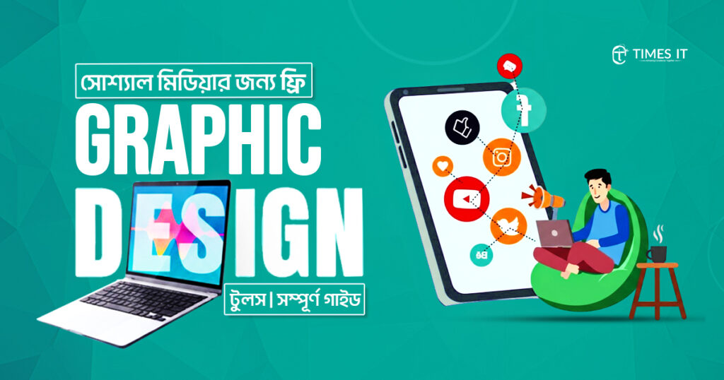 সোশ্যাল মিডিয়ার জন্য ফ্রি গ্রাফিক ডিজাইন টুলস নিয়ে টাইমস আইটির একটি প্রোমোশনাল ডিজাইন যেখানে ল্যাপটপ, স্মার্টফোন, সোশ্যাল মিডিয়া আইকন এবং একজন শিক্ষার্থী ল্যাপটপে কাজ করছে।